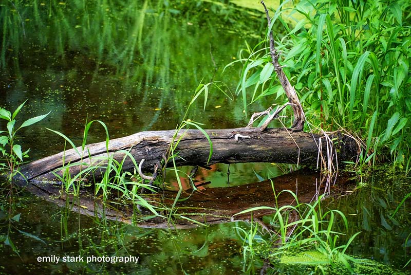 Weathered Log September 1, 2025 by Emily Stark A log reflects in a little pond speckled with duckweed at the Landscape Arboretum in Chaska, MN.