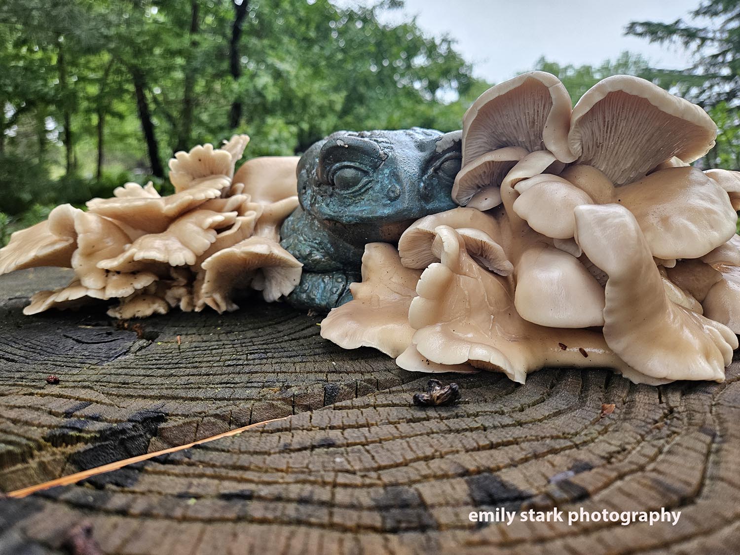 Toad and Mushrooms July 18, 2025 by Emily Stark Mushrooms growing out of a stump around a toad statue.