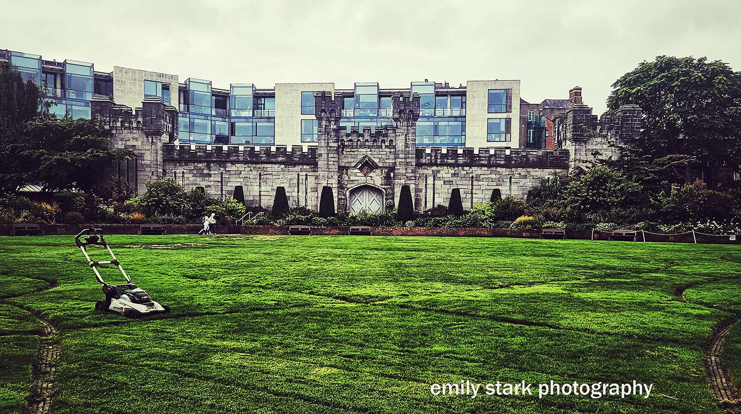 A lawnmower on the pristine lawn at Dublin Castle, in Dublin, Ireland.